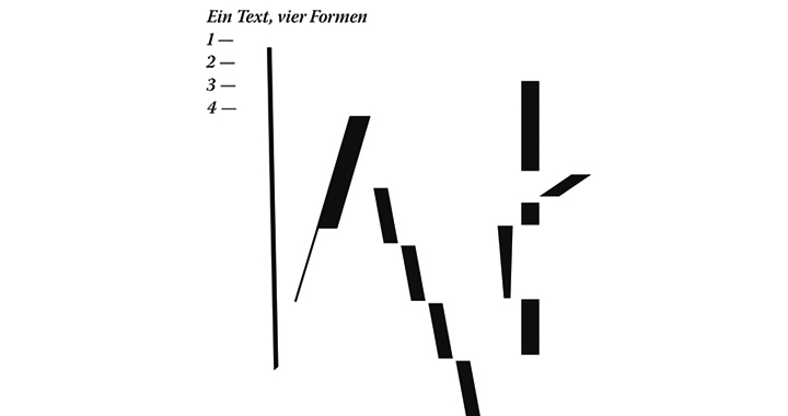 Variante 1 bringt den Text in konventionellem Blocksatz, die Varianten 2 und 3 gliedern Riklins verschachtelte BabuschkaSätze dann mehrfach anders. Das schafft eine eigentümliche dritte Lesedimension, manchmal flimmern die Augen wie der Asphalt der Römer Strassen in der Sommerhitze. Variante 4 schliesslich strapaziert die Leserin mit allerhand Schrift-Wildwuchs und aufwendiger Links-Rechts-Typographie – gewöhnungsbedürftig. Im Ganzen macht die vierfache Gestaltung aber raffiniert auf die Möglichkeiten heutiger Buchgestaltung aufmerksam. Das Spiel mit Schriftgraden hat so zweifellos, wie alles, seinen tieferen Grund.