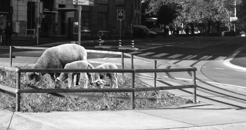 Wochenlang hatten Passanten über den Sinn der Einzäunung gerätselt – die naheliegendste Deutung: Holzhag, aha, das Appenzellerland beginnt jetzt am Spisertor…, war auch nicht wirklich befriedigend. Jetzt aber klärt sich die Sache aufs Schönste und Wolligste. Besucher des Streichelkreisels werden allerdings gebeten, auf den Verkehr aufzupassen. Und sich warm anzuziehen – denn das nierenförmige neue Haltestellendach, im Hintergrund erkennbar, nützt nur bei Schönwetter.